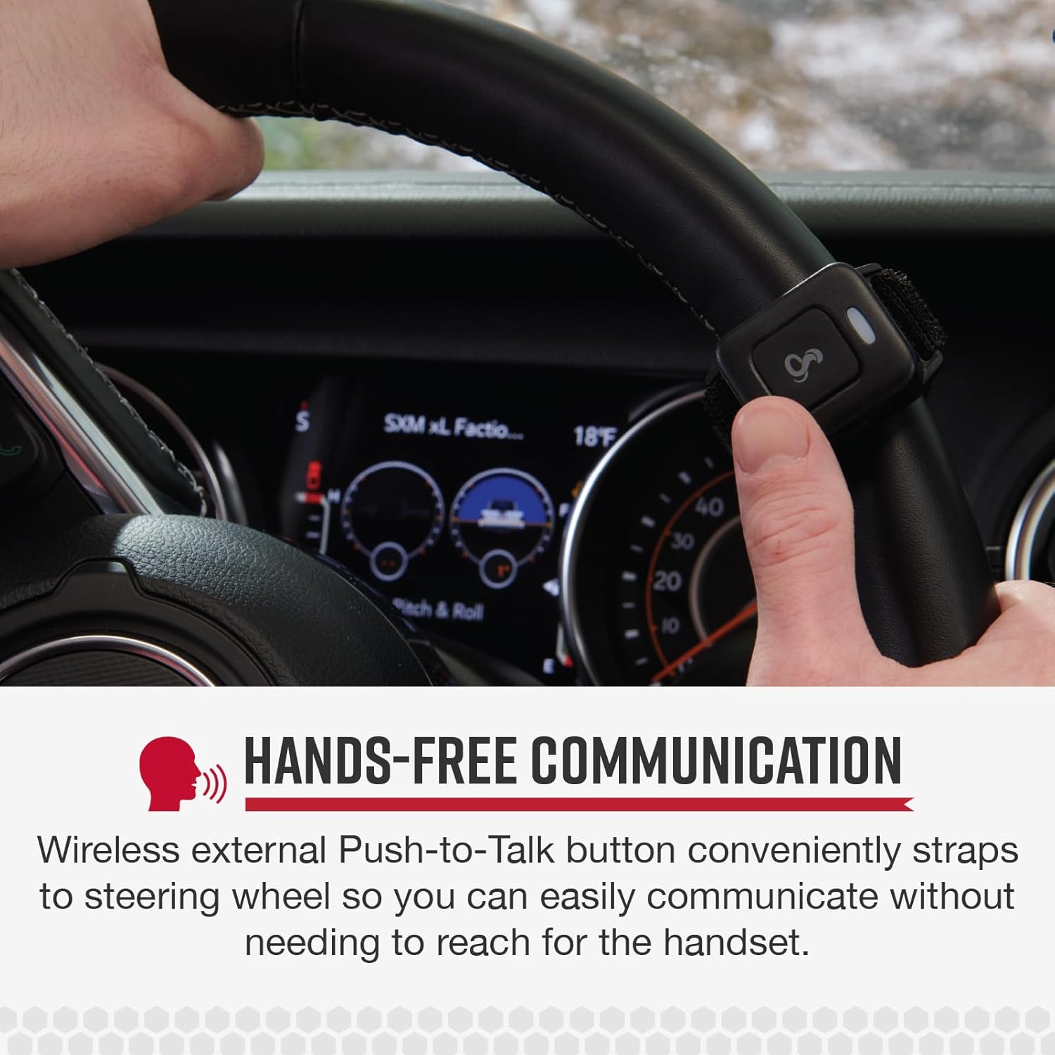 All Road PTT Button exclusively designed to be paired with the 75 All Road CB Radio. Wireless external Push-to-Talk button conveniently straps to your steering wheel so you’re able to easily communicate without needing to reach for the handset, allowing you to keep your eyes, hands, and concentration on the road. The PTT Button includes a Velcro strap and power/charging cord.