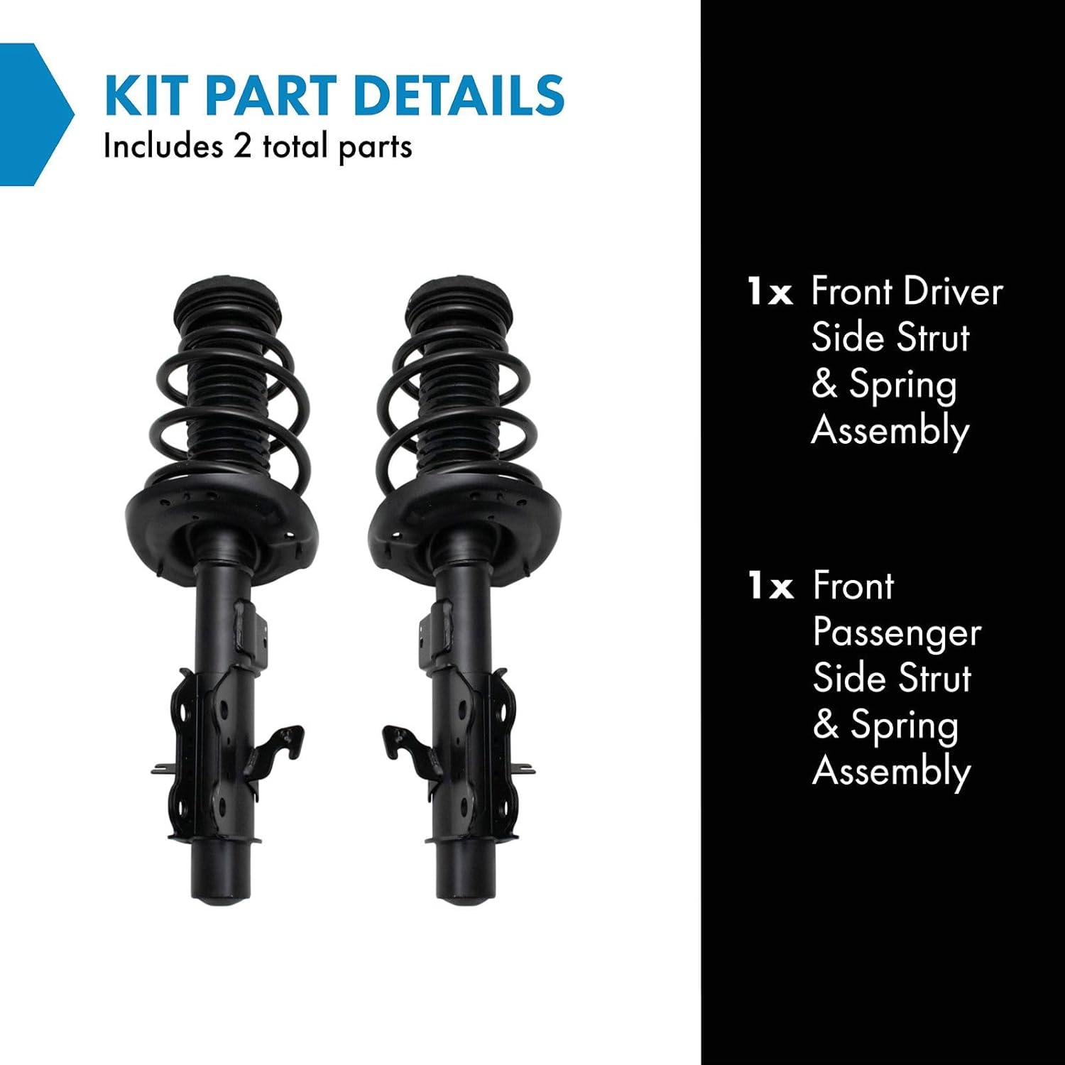 2 Piece Strut & Spring Assembly SetKit Includes(1) Front Driver Side Strut & Spring Assembly(1) Front Passenger Side Strut & Spring AssemblyFitmentChevrolet Camaro 2013-15 - LS Front Driver & Passenger Side 2013-15 - LT Front Driver & Passenger SideProduct AttributesQuantity: 2 PieceProduct Features Loaded Struts: Pre-assembled application specific design Application Specific Design: No modifications necessary Matched Pair: Improved comfort and extended service life Restored Performance: Reduced body sway and vibrationItem DetailsTRQ fully loaded shocks and struts are manufactured using premium raw materials and calibrated to restore original ride comfort. TRQ shocks are fully loaded featuring a pre-loaded bearing plate, upper and lower spring isolator, upper spring seat, coil spring, boot kit, and premium strut. TRQ recommends replacing your shocks or struts in pairs to ensure even wear of components and improved ride comfort. All products are fit and road-tested in our Massachusetts R&D facility to ensure we deliver on our promise of Trusted Reliable Quality.Reference Numbers172912172913527-01992R527-01993L