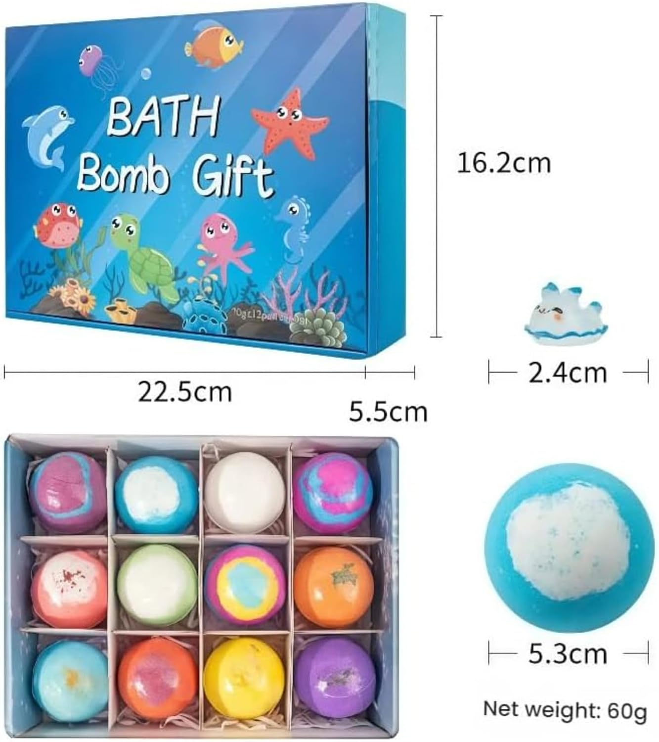 Specification: Theme: Ocean Animal (12 unique toys inside) Pack Quantity: 12 bath bombs Net Weight: 2.1oz (60g) per bath bomb, total 25.2oz (720g) Packaging Dimensions: 8.66 x 5.91 x 3.94 inches